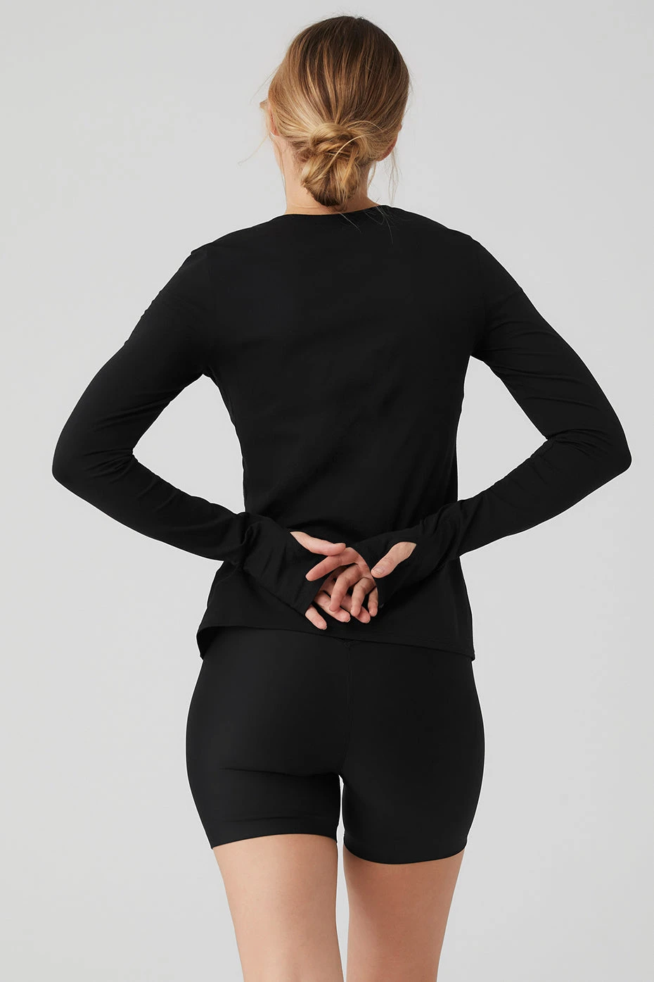 Bring the feels. The Alosoft Finesse Long Sleeve is made with soft performance jersey and has a comfy, relaxed silhouette, so you can stay cozy and on-trend from yoga to lounge. Looks so good layered under jackets.