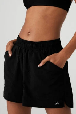 Bend, stretch, hike and explore new heights in the Alumni Short. Made in our lightweight, sport-ready woven fabric, it features a flattering high-waist design, an easy internal drawcord, and side slit pockets to store keys, lip balm and other small essentials. Go head-to-toe and hit the pavement with the matching cropped pullover.