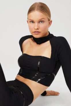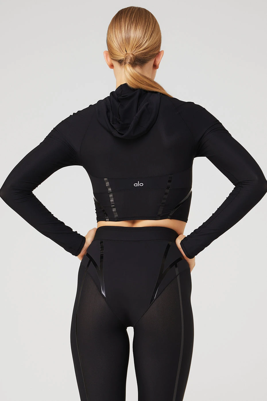 The Day Break Corset Long Sleeve Top is fitted and cropped, making it an ideal, ultra-forward base layer. High-shine corset detailing provides stunning structure to this performance-equipped style, which features sheer mesh and a fitted, balaclava hood with a functional slit for ponytail styling.