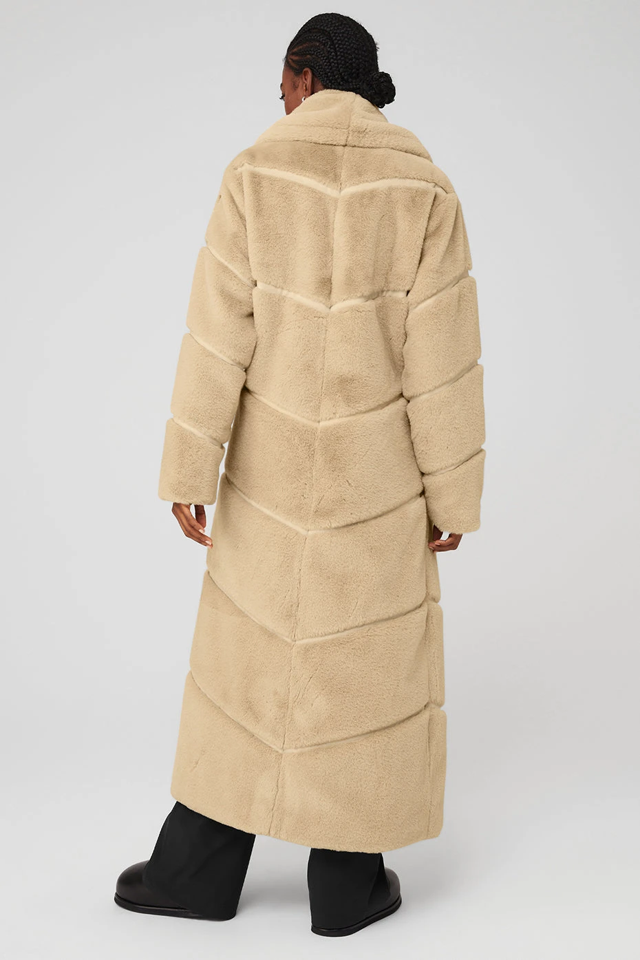 A forward take on the iconic, floor-length fur coat, the Faux Fur Cascade Jacket is a sweeping statement made in plush, unbelievably realistic, cruelty-free fur lined with satin. Buttery faux-leather chevron splicing creates depth and dimension, while an exaggerated shawl collar provides added warmth. Zippered front pockets and a hook-and-eye closure add functionality to this floor-length look.