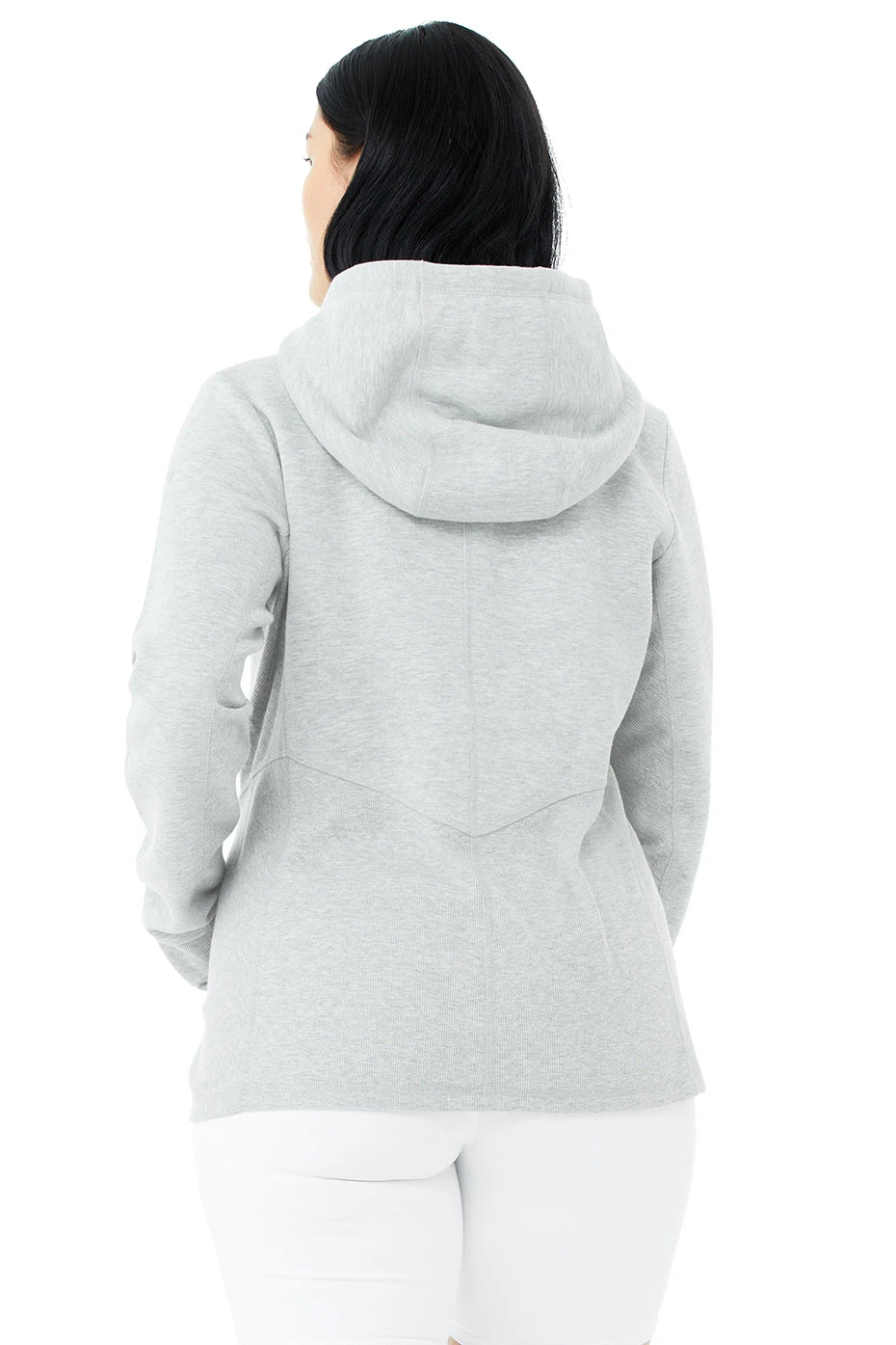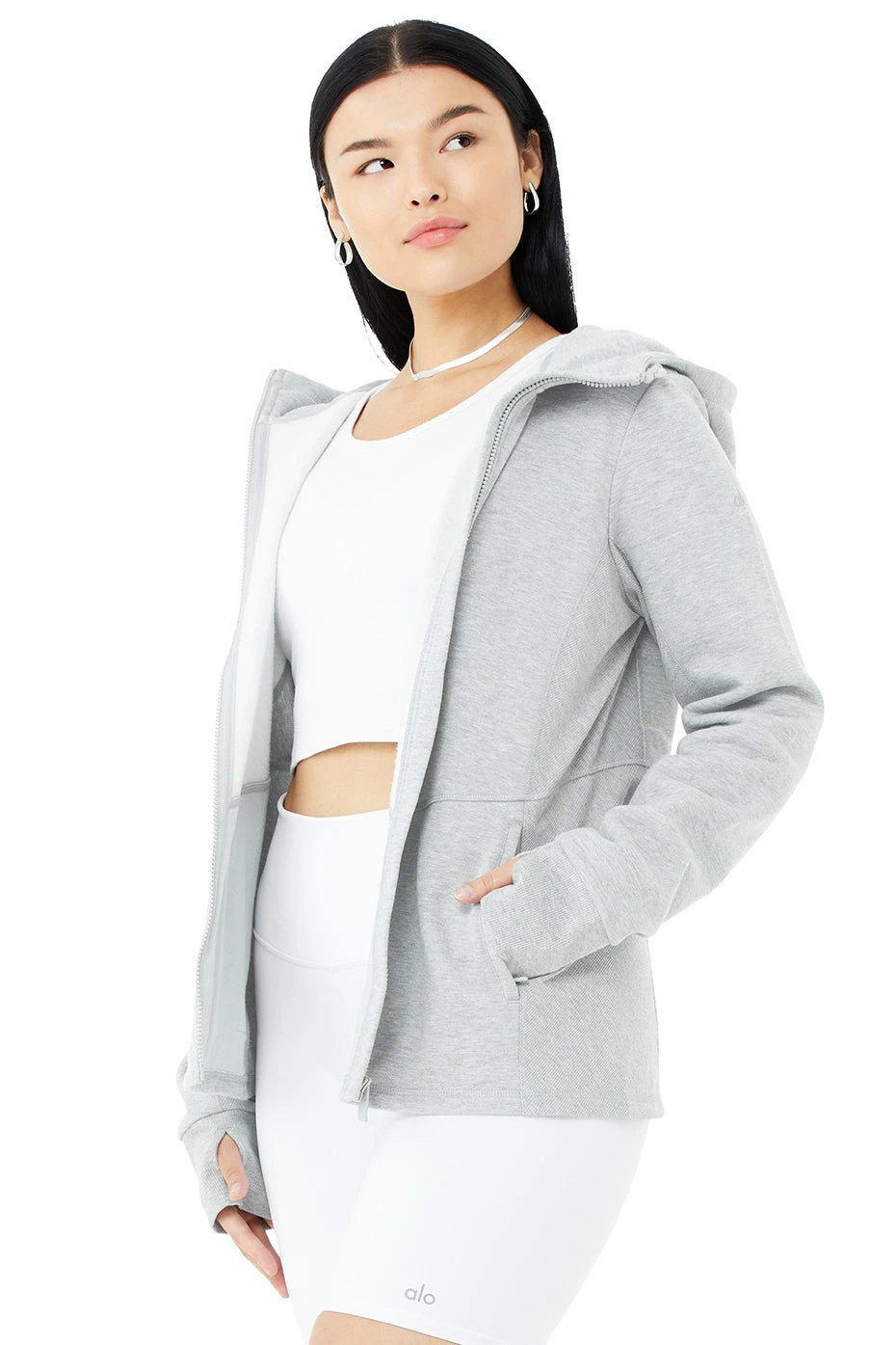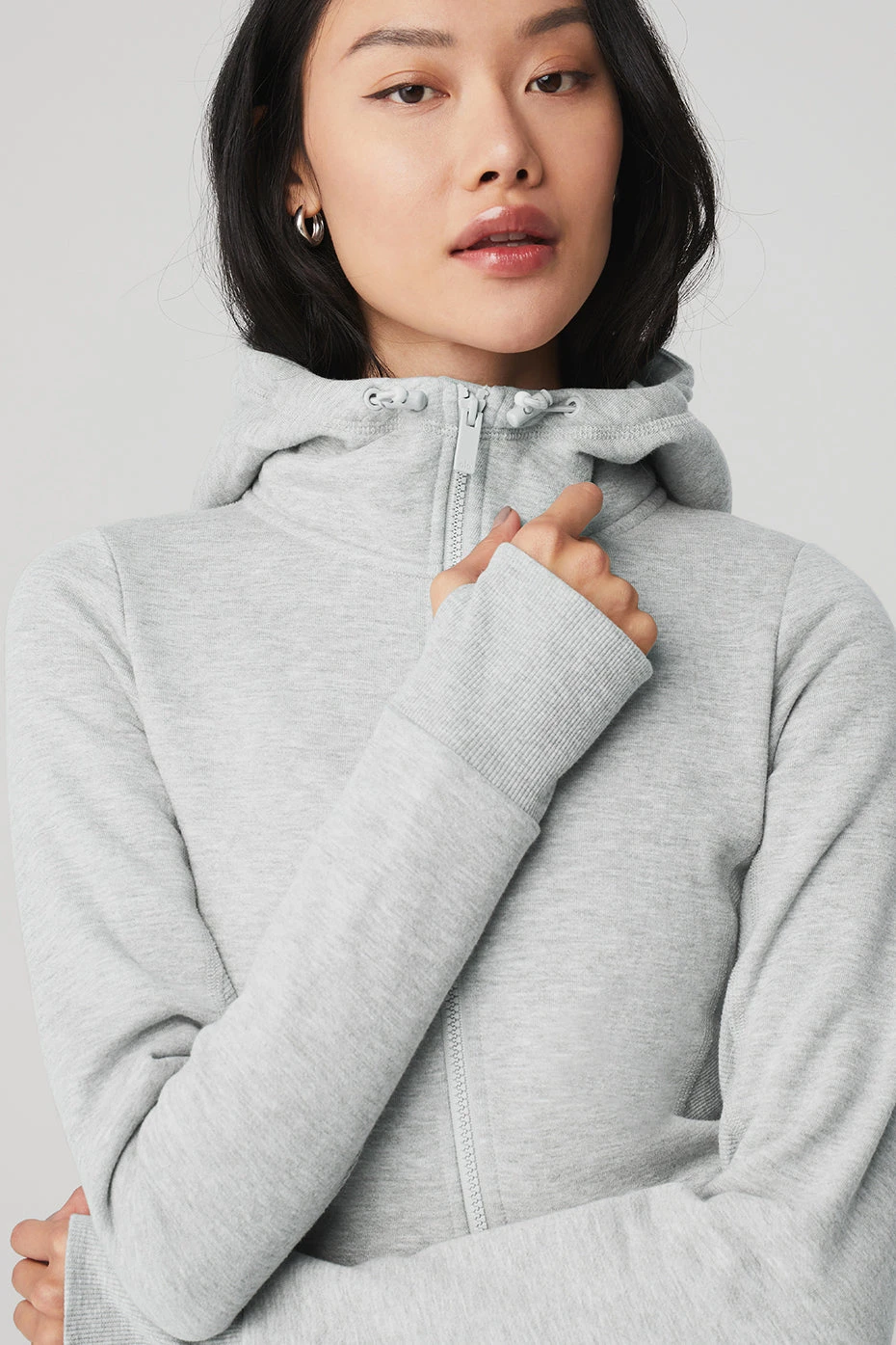 So sleek. So contouring. So ready to run, lift, flow & move in any way you choose. The Foundation Zip Hoodie in light fleece is the perfect blend of beauty & function, with chevron ribbed detailing, handy thumbholes, zippered side pockets & a three-panel hood with bungee closures.
