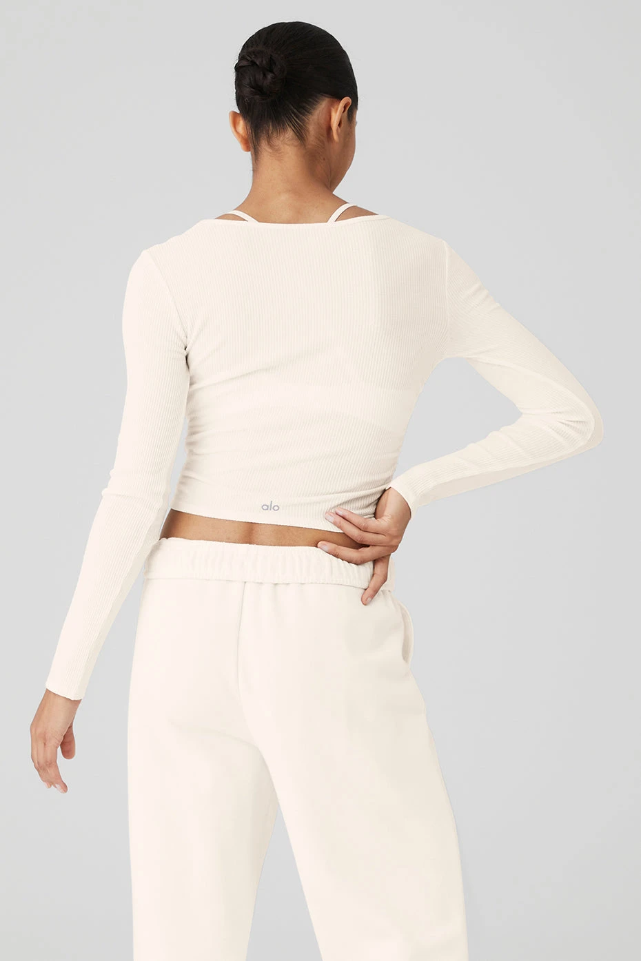 Put the “warm” in warm-up with the Gather Long Sleeve. It’s made with a soft ribbed knit and has a cropped, fitted silhouette and cute cinched sides. Pairs pretty with the High-Waist Goddess Legging.