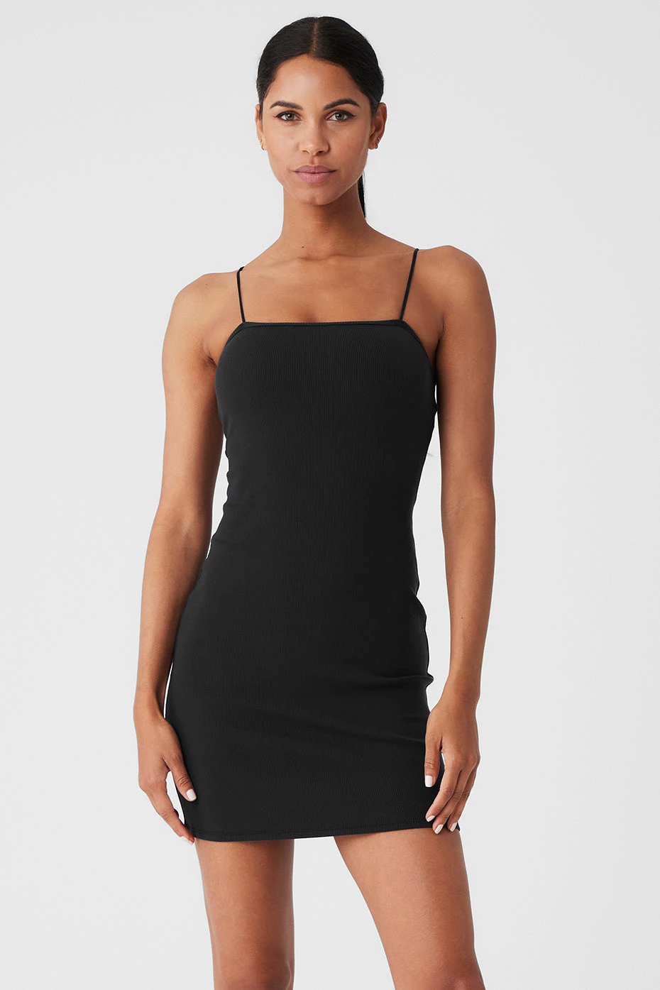 Goddess Ribbed Spaghetti Strap Dress – Black