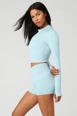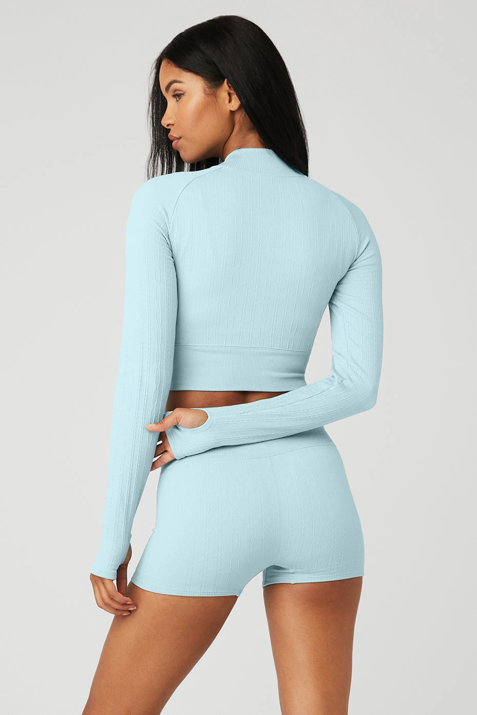This cozy-chic layer is the chillest in chilly months. The Seamless Cable Knit Long Sleeve Top is made in an ultra-soft, seamless cable knit, with a sleek fit and on-trend mock neck. Slip it on with comfy high-waist leggings for a cool, studio-to-street look.