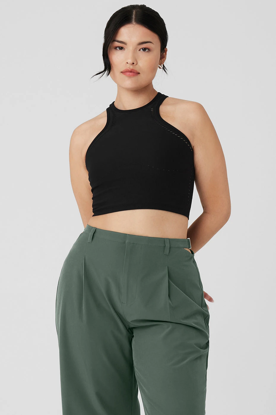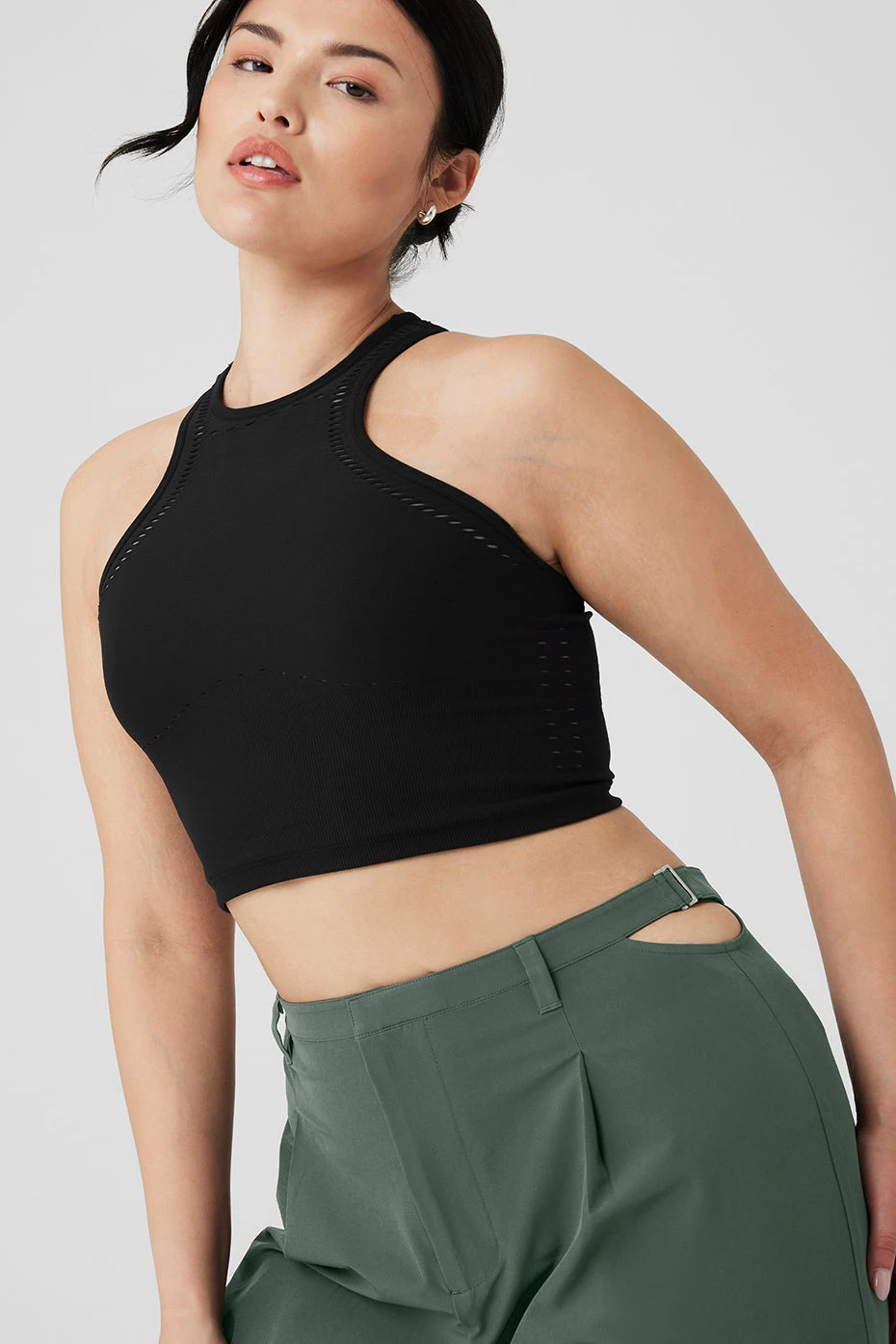 Feel the breeze in the ultra-breathable, lightweight Seamless Open Air Racerback Tank. A longer-length companion to our bestselling Open Air styles, this high-neck tank features a racerback and cool cutout details at the bust and back. Light support and a cup-free design make this a go-to for low impact activities or everyday wear. Wear it with Open Air leggings or an Alo tennis skirt.